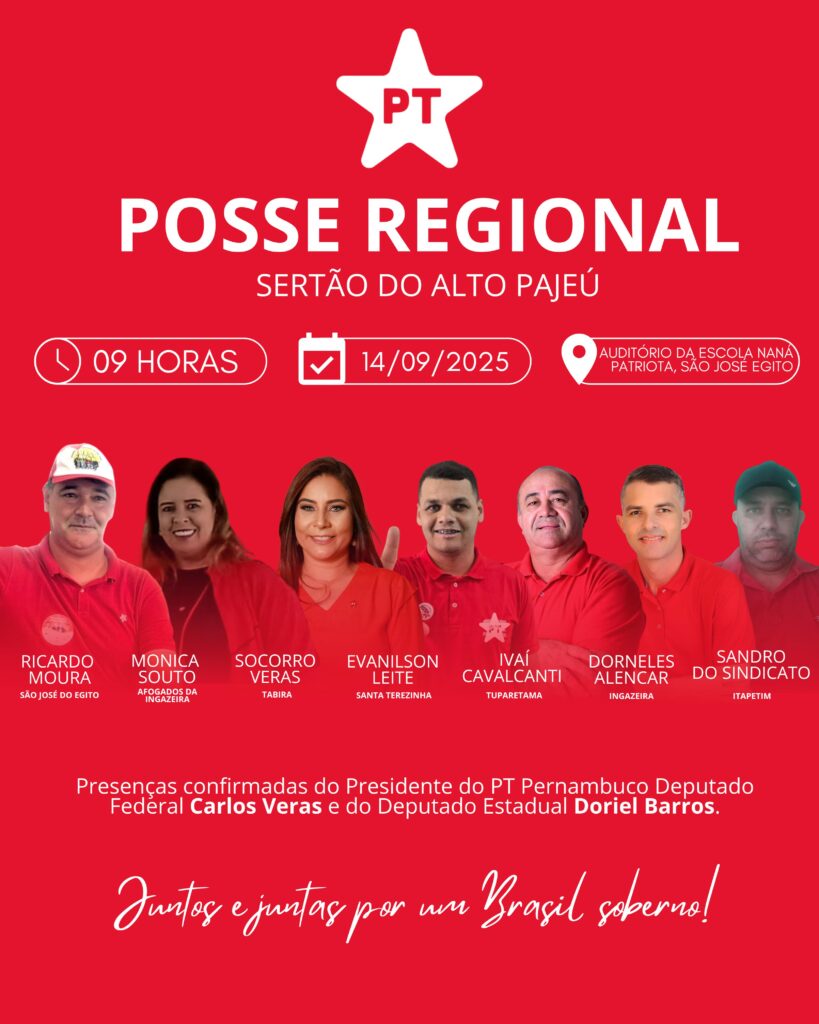 No dia 14 de setembro de 2025 aconteceu na Cidade de São Jose do Egito-PE, a posse dos Diretórios Municipais do PT, onde 07 Municípios participaram; Santa Terezinha, Itapetim, São José do Egito, Tabira, Tuparetama, Afogados da Ingazeira e Ingazeira. Foi uma posse histórica a nível Regional, os presidentes dos Partidos discursaram e mantiveram a ideia de uma ação conjunta no Sertão do Pajeú, defendendo um projeto de cooperação e valorização da classe trabalhadora, o maior compromisso foi a reeleição do Presidente LULA e do Senador Humberto Costa em 2026, assim como a ampliação da bancada do PT no Congresso Nacional, e só a união vai garantir o processo de fortalecimento das bases. Esteve presente no ato de posse o Deputado Federal Carlos Veras, que foi eleito e empossado recentemente Presidente do Diretório Estadual do PT-PE. Também se fizeram presentes o prefeito de Tabira Flávio Marques do PT-PE, o prefeito de São José do Egito Fredson Brito, e Lideranças do Poder Legislativo de Vários Municípios. A solenidade Finalizou com todas as diretorias dos diversos diretórios empossados para o quadriênio de 2025 a 2029 pelo então Presidente Estadual do PT Carlos Veras.
